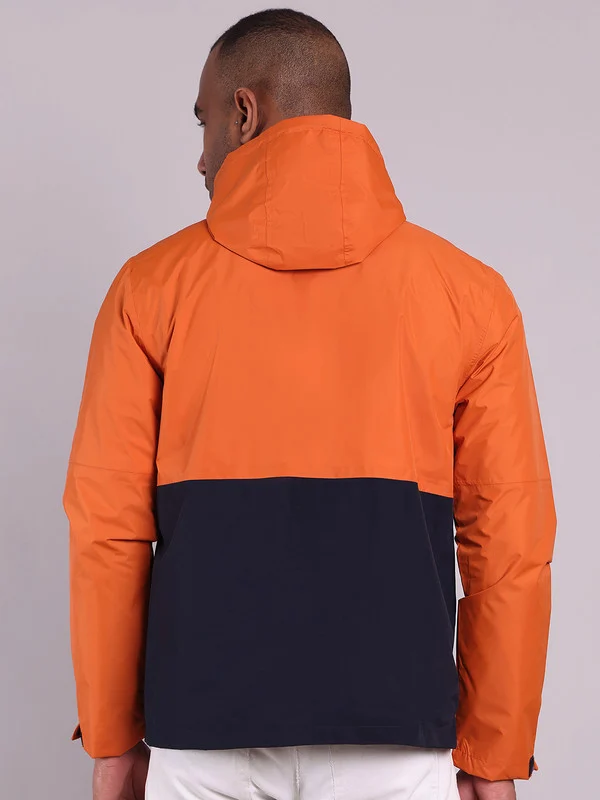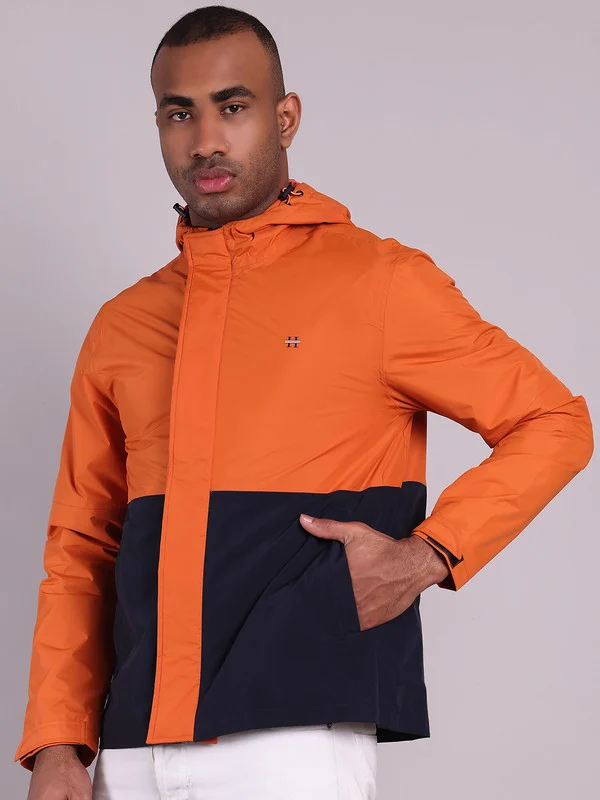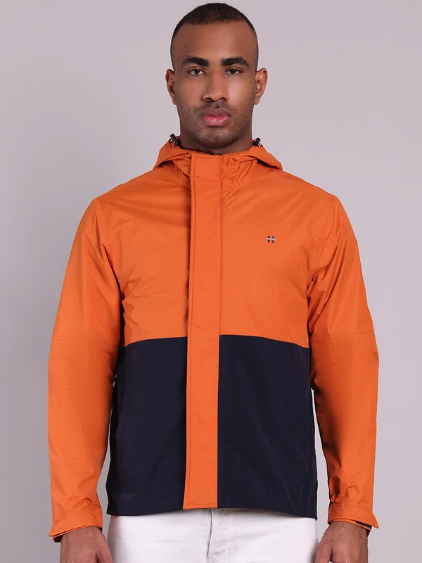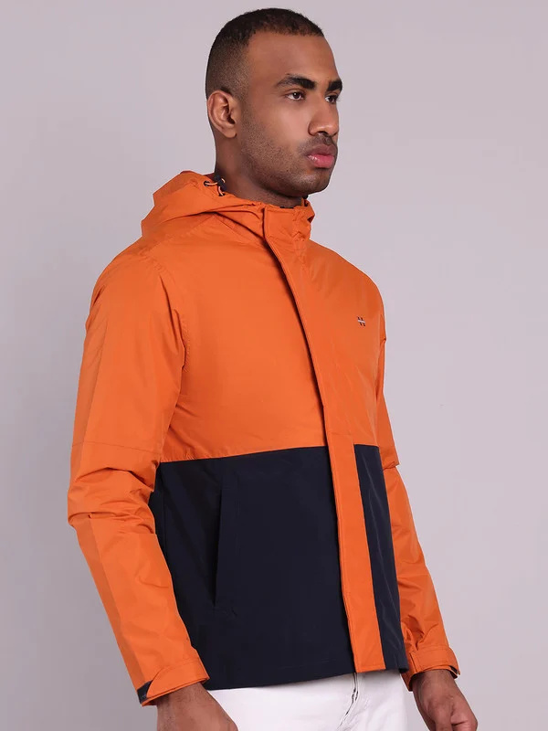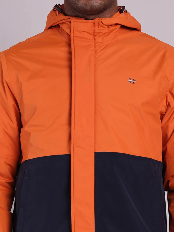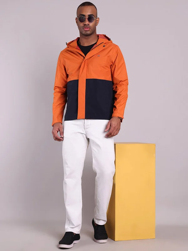 HOUSE OF VEDAS Premium Quality Mens Rain Jacket Product Display in India. Durable navy rust windcheater online shopping.Rust/Navy Color Block Hooded Rain Jacket